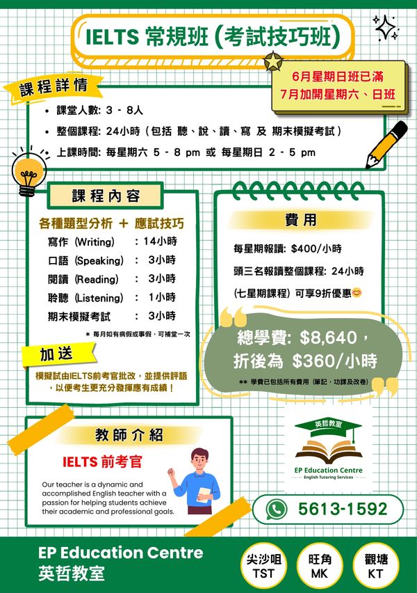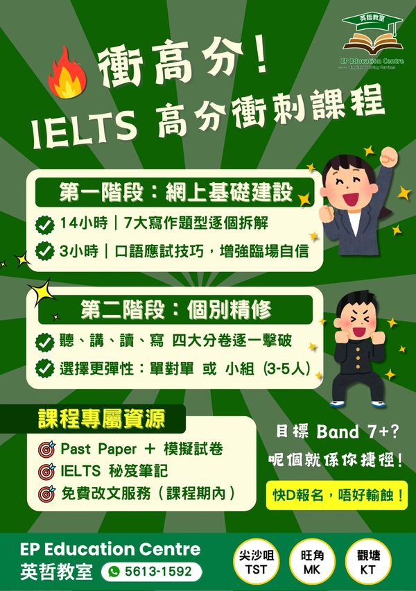 適合對象: 想在短期內提升實戰分數、有明確申請時限或需衝刺高分(目標 7.0或 以上)的高中生、大學生及在職考生。