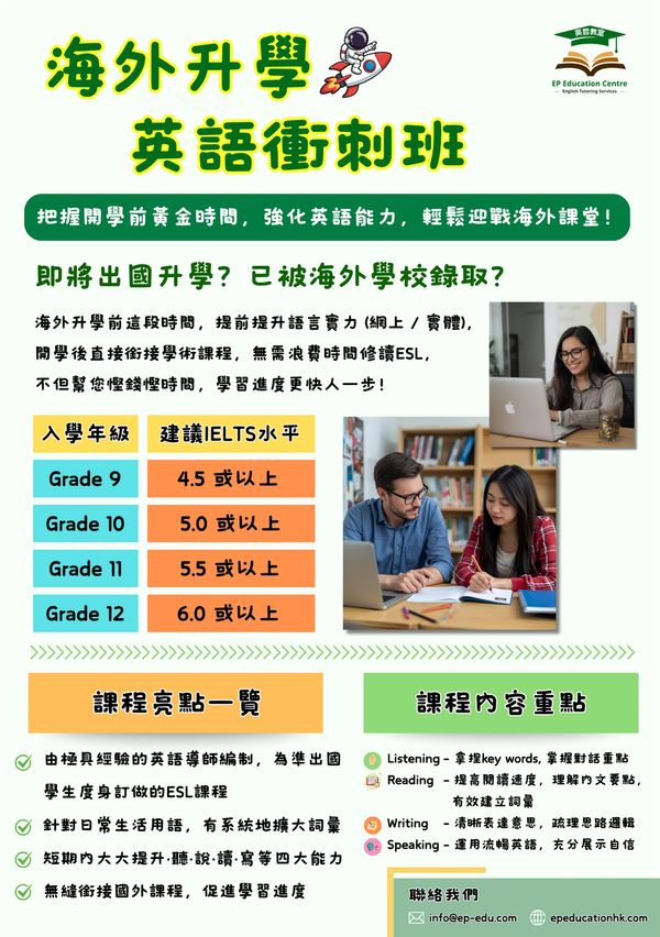 專為即將出發到海外升學的學生而設,於出發前裝備學生以應付海外升學的課程和日常生活用語。