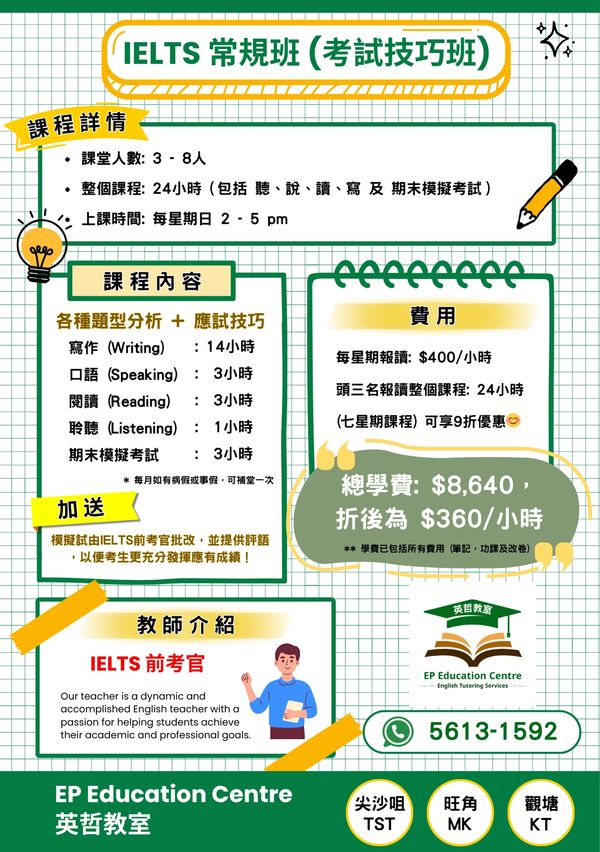 電話 / WhatsApp:(852) 5613-1592 辦公室: 九龍觀塘海濱道 135 號 宏基資本大廈8樓802室 (牛頭角港鐵站B6出口) 觀塘分校 | 旺角分校 | 尖沙咀分校